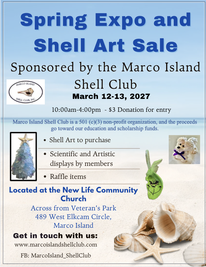 Spring Expo and Shell Art Sale sponsored by the Marco Island Shell Club. 10:00am-4:00pm Friday and Saturday, March 12-13, 2027.