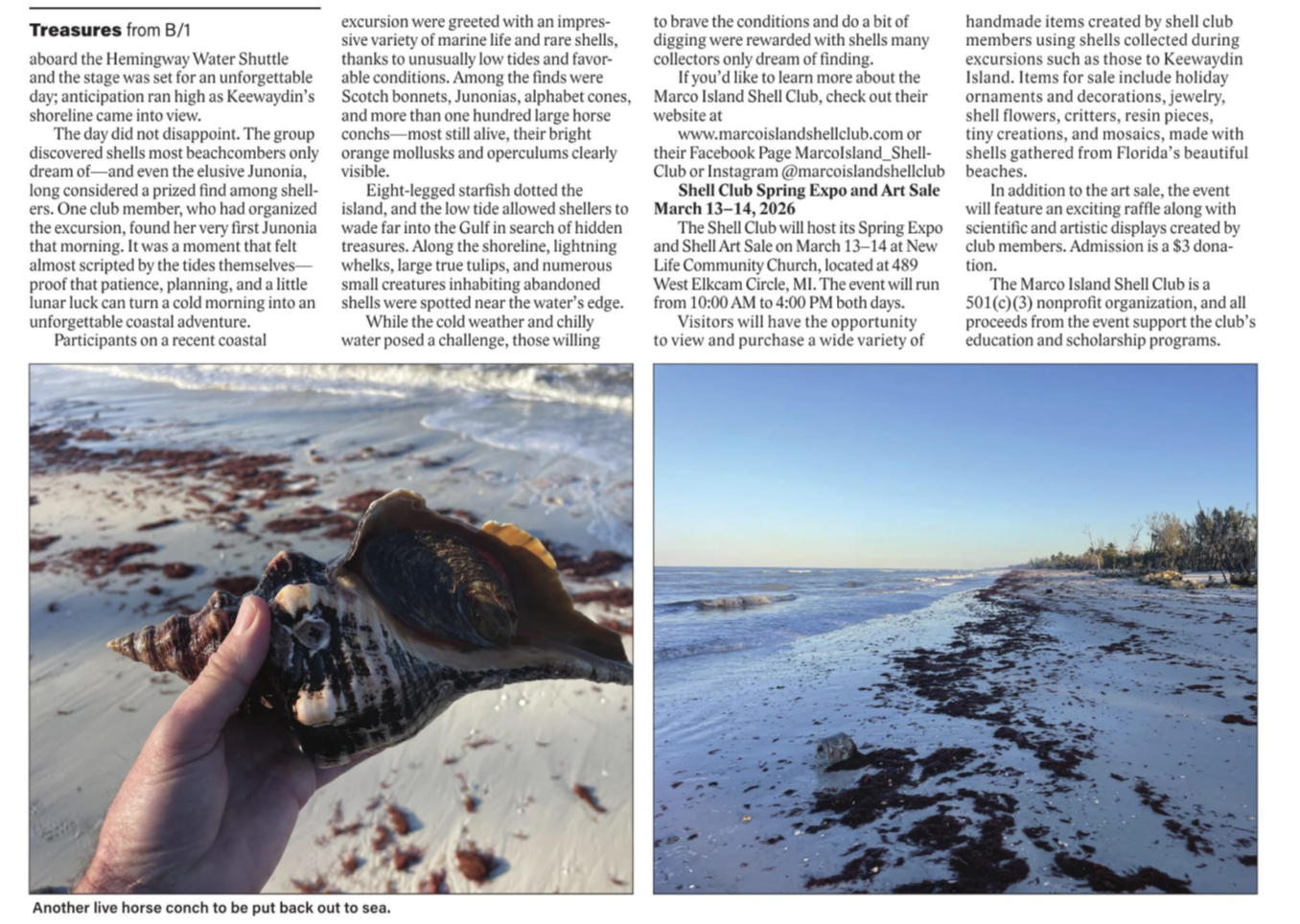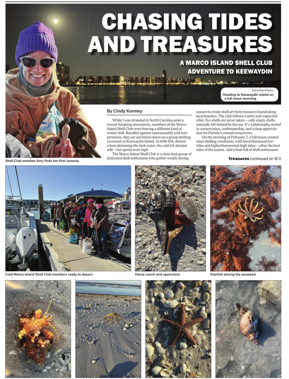 The club also partakes in annual excursions to other local islands near Marco Island which are rich in the offerings of the sea. Each year, members of the Marco Island Shell Club take an excursion in the early morning aboard the ferry to Keewaydin Island, one of the barrier islands just North of the Marco River where one can find a large variety of shells, sand dollars, coral, and other treasures from the sea.